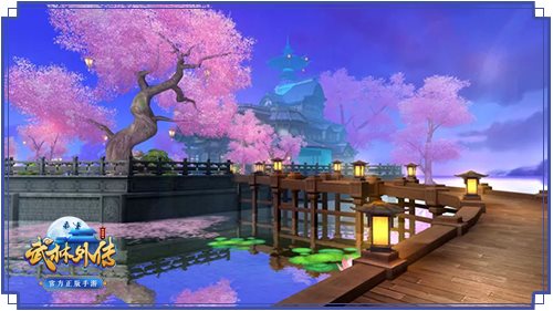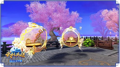全新的客栈外景樱花满布,间或有几只火烈鸟缓步走过。在四下转转,还有华丽的坐榻可供客官休息小憩。樱花树上挂着风铃,随风摇动,为宁静的夜晚吹一曲安心谣。