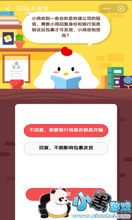 支付宝蚂蚁庄园小课堂1月17日:小鸡收到一条自称是快递公司的短信,需要小鸡回复身份和银行信息验证后包裹才可发货,小鸡该相信吗