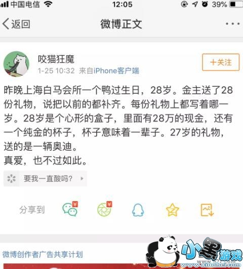 上海白马会所富婆送28份豪礼真相竟然是这样?最近有网友在微博上晒出白马会所某男收到礼物的照片,上面摆满了各种礼物总计28份,接下来小黑游戏下载小编给大家带来上海白马会所富婆送28份豪礼真相。