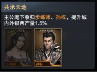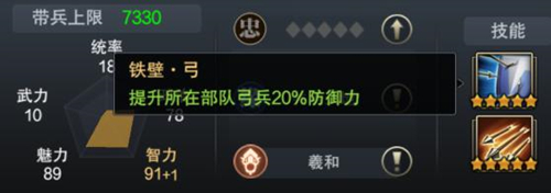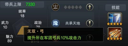 在缘分方面,步练师和孙权可组成“共承天地”的缘分组合,若主公麾下同时拥有步练师和孙权,即可增加城内外银两产量的1.5%。技能方面,第一个技能“铁壁·弓”使部队弓兵的防御属性提升20%,提升率较大;第二个技能“无双·弓”是军团弓兵攻击属性提升10%,提升率和徐庶一致。既有部队技能,也有军团技能,步练师还是一个颇为实用的弓兵智力将,主修弓兵的主公们千万不要错过!