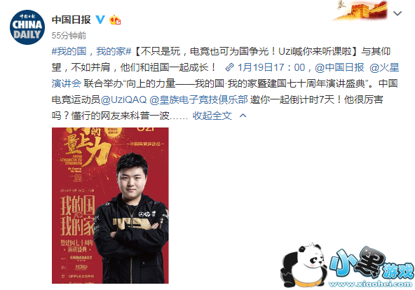【不只是玩,电竞也可为国争光!Uzi喊你来听课啦】与其仰望,不如并肩,他们和祖国一起成长!1月19日17:00,中国日报火星演讲会联合举办“向上的力量——我的国·我的家暨建国七十周年演讲盛典”。中国电竞运动员@UziQAQ@皇族电子竞技俱乐部邀你一起倒计时7天!他很厉害吗?懂行的网友来科普一波……