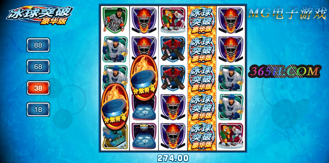 免费游戏:3-5个分散燃烧的冰球(SCATTER)可以有几率获得相应的15-25个免费游戏。在冰球免费游戏的模式中,只要有成排的燃烧冰球图案出现,奖金就能翻两倍了。获得奖金的图案被击破后,如果掉落的图案还能获得奖金,那么奖金就会翻三倍;依次类推,第三次掉落的图案继续被击破,奖金翻四倍;第四次掉落的图案仍能被击破的话,奖金翻五倍;而如果第五次掉落的图案你还能获得击破,无论多少,你都将获得奖金翻十倍的奖励!