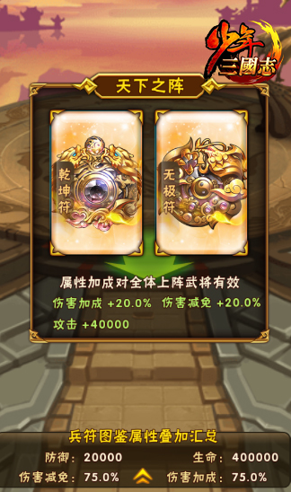 “乾坤、无极”两个暗金兵符,不仅可在对战中发挥莫大的作用,玩家还可通过战魂玩法,进一步提升全体阵容的属性。此外,玩家在拥有“乾坤符”和“无极符”两个暗金色兵符后,还可以在游戏中激活最后一个暗金兵符图鉴——“天下之阵”,提升高达75%的伤害加成和减免,并提升上阵武将防御和生命属性,加强武将的生存和输出能力。