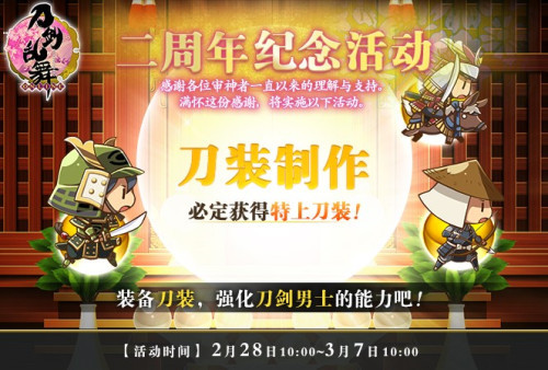 为庆贺中文版全平台上线二周年,特开启二周年纪念活动。2月28日10:00-3月7日10:00活动期间审神者进行刀装制作将不会失败,必定获得特上刀装。通过装备优良刀装,强化刀剑男士的能力吧!