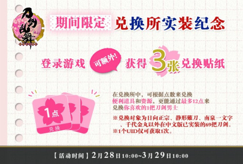 除1月31日至2月12日活动期间每日登录赠送的「兑换贴纸」外,为纪念《刀剑乱舞-ONLINE-》中文版兑换所实装,审神者在兑换所开启期间任意1天登录游戏,还可在邮箱内领取1次额外的兑换所实装登录奖励:「兑换贴纸」*3。