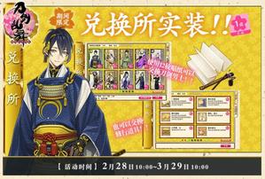 2月28日10:00-3月29日10:00活动期间,为庆贺中文版全平台上线二周年,特开启兑换所。活动期间,审神者在兑换所中可以使用12枚「兑换贴纸」交换刀剑男士,具体可交换对象为日向正宗、静形薙刀、南泉一文字、千代金丸以外在中文版已实装的69位刀剑男士。同时,一定数量的「兑换贴纸」也可以交换修行道具等其他道具。
