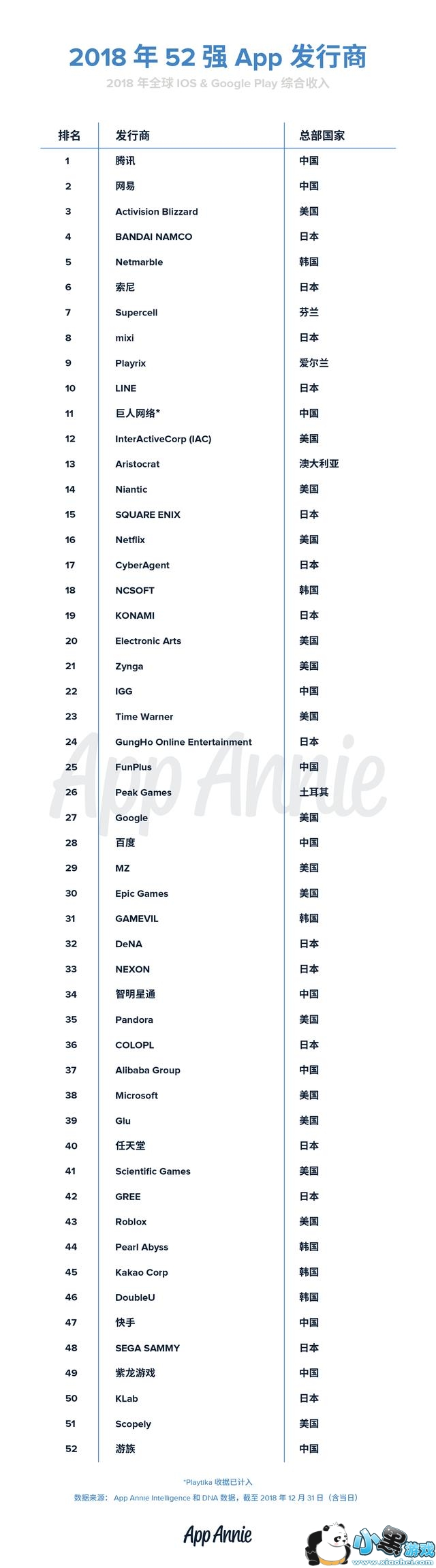 2019年2月26日,领先的全球移动数据和分析服务商App Annie今天公布了2019年度52强发行商榜单,评选出Google Play和iOS App Store两大App商店收入佼佼者。