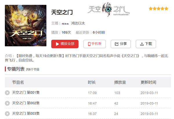 《天空之门》有声小说于3月11日正式上线蜻蜓fm,力邀实力派主播宏宇演绎跌宕起伏的史诗般剧情,讲述不为人知的上古传说。宏宇其人,长期从事电台播音及有声小说演播工作,声音沉稳磁性,表现力丰富,能驾驭多种类型题材,代表作品有:《枭臣》《间岛铁骑》《雍容天下》《九越阙天》《我的灵异事件簿》等人气著作。这次与大神级失落叶的最新力作《天空之门》合作,可谓是强强联手,与小说保持着同步更新连载,为听众逐步营造出身临其境的魔幻世界。