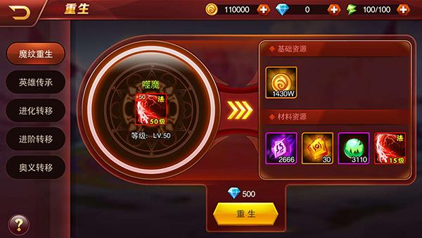 此外,魔纹的培养是可以为所欲为的。仙豆手游《兽人三国》的“魔纹重生”能够让已经培养到高级魔纹“回到原点”,变回初始等级,而且原封不动地返还全部魔纹强化材料。因此,在缺乏高级魔纹的前期,不妨优先培养合适的紫色魔纹。魔纹重生后完全无损耗,又不耽误英雄的培养,一举两得!
