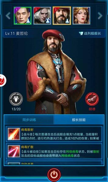 麦哲伦与杜威舰长则率领战列舰。战斗技均为“病毒散射”,攒足能量即可进行灼热激光打击,如果所攻击战舰有网络病毒状态,此次攻击将产生散射。
