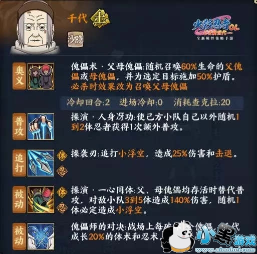 千代可以召唤父母傀儡为己方忍者提供护盾,且当父、母傀儡同时存在时,千代的普攻将变为群体攻击,造成大量伤害。