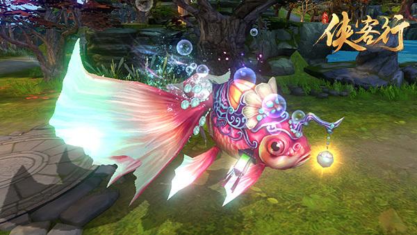 区别于以往的霸气虬龙,逗比驮马等,本次设计是基于呆萌,炫彩的金鱼外型设计,大量的流光和水泡效果,搭配扭动的鱼尾,给侠客行世界增加了一道新色彩。