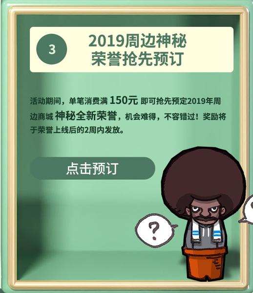 活动期间,单笔消费满150元即可抢先预定2019年周边商城神秘全新荣誉,机会难得,不容错过!奖励将于荣誉上线后的2周内发放。