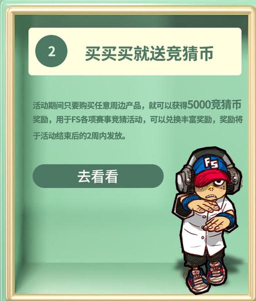 活动期间只要购买任意周边产品,就可以获得5000竞猜币奖励,用语FS各项赛事竞猜活动,可以丰富兑换奖励,奖励将于活动结束后的2周内发放。