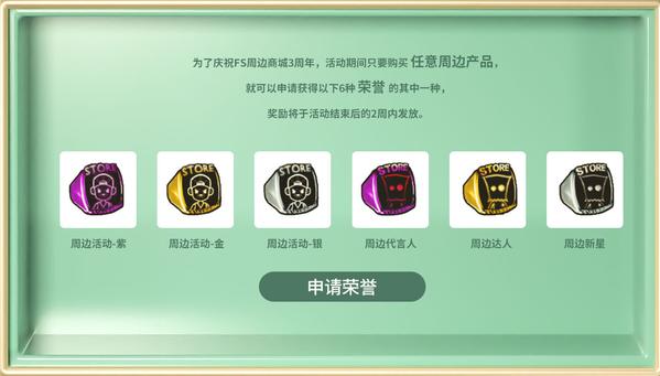 为了庆祝FS周边商城3周年,活动期间只要购买任意周边产品,就可以申请获得以下6种荣誉的其中一种,奖励将于活动结束后的2周内发放。