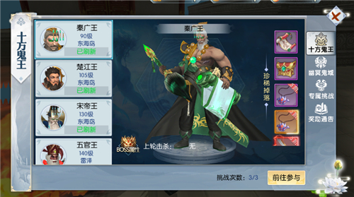 进入游戏后点击屏幕上方的【BOSS】即可看到6大模块:十方鬼王、专属挑战、幽冥鬼域、北冥深渊、南冥天地、奖励通告。今天我们就着重的介绍下【十方鬼王】的攻略。