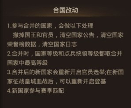 赛季排名领先的国家自然能够获取丰富奖励,但是赛季排名末尾的国家将被安排进行合国,合国后重新开启官员选举,各项国家数据将被清空,重新进行独立。