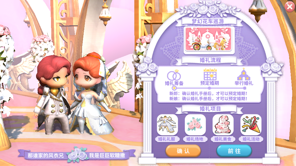 在确认婚礼流程后,可以在卢米娅主城内找到神父,预约自己的婚礼和花车巡游时间,预约成功后,在指定时间内,和自己心仪的伴侣坐上童话花车,婚礼巡游卢米娅!让所有人见证属于你们的幸福!
