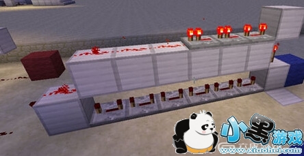 这样制作好的线路,电梯只能上下移动,然后按照之前的方法,在顶部安装1到2个启动源,然后布置向下的电路。图片红色方块是启动源的输出,而这个向下电路贴的也很紧,一样也是4个中继。