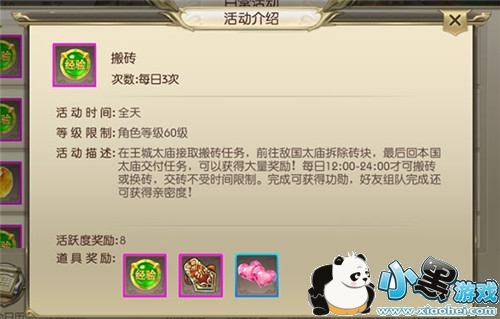搬砖任务每天可以完成三次,完成之后可以获得经验值、功勋以及道具奖励,如果和好友一起组队的话,还可以提高两者之间的亲密度。