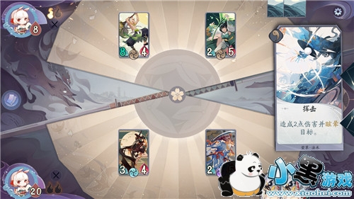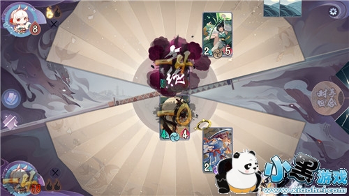 等下一个回合他们攻击我们时,妖刀姬会自动触发见切卡牌发动反击,这样的话就可以解决山童了,然后我们再将妖刀姬拉到对战位置上来对抗莹草,只要不主动进行攻击,莹草就无法发动自己的响应技能,我们就可以轻松的使用犬神将对面骑手击败,完成这个试炼的胜利了。