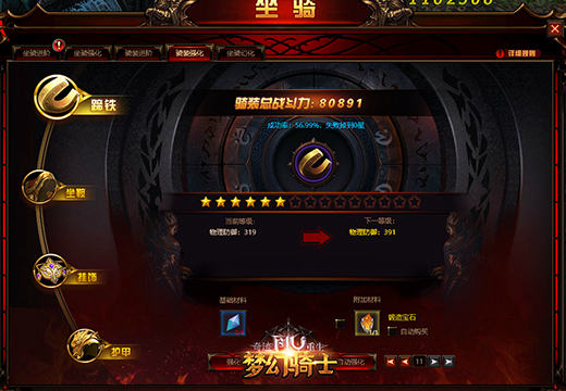 塔人《奇迹重生:梦幻骑士》不但玩家可以穿戴装备,强化装备来提升战斗力,坐骑也有自己独有的装备,分别是“蹄铁”“坐鞍”“挂饰”“护甲”四件装备。激活全部四件装备可以大幅度提高坐骑为玩家增加的属性。而且这四件装备同样也是可以进阶和强化的,比如挂饰装备在强化和进阶之后能够为玩家提供大量的“攻击力”属性加成!