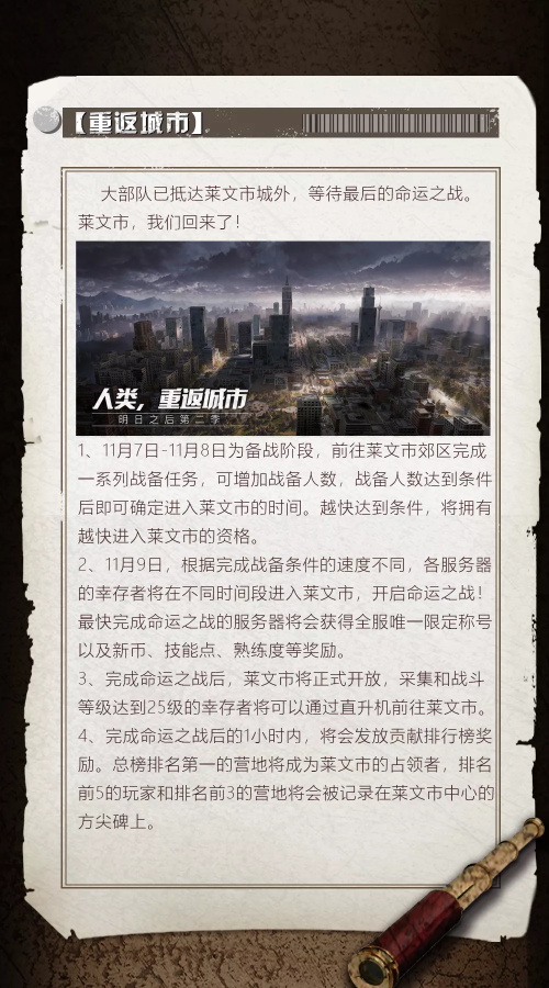 明日之后11月7日更新了什么?第二季新地图莱文市如何玩? 随着11月7日的更新,大量的新玩法、新机制、新内容推出上线,为11月带来了新的乐趣,一起来看看吧。