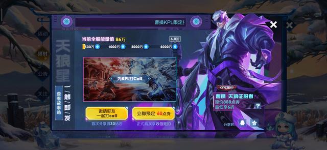曹操KPL皮肤现在已经正式开启预定啦,只需要花费60点券就可以获得专属头像框以及皮肤的体验卡,下面让我们一起去了解一下更多内容吧。