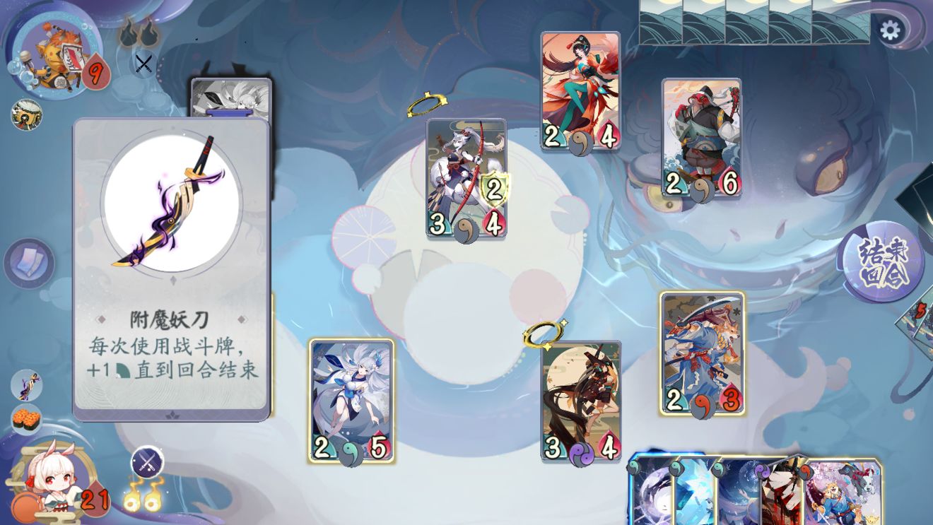 大天狗的生命值为30点,在后面的关卡会出现,他的卡牌核心输出为法术,其中包含萤草、大天狗、凤凰火、兵俑,大天狗和火凤凰的等级为三级,其他的式神等级是二级。