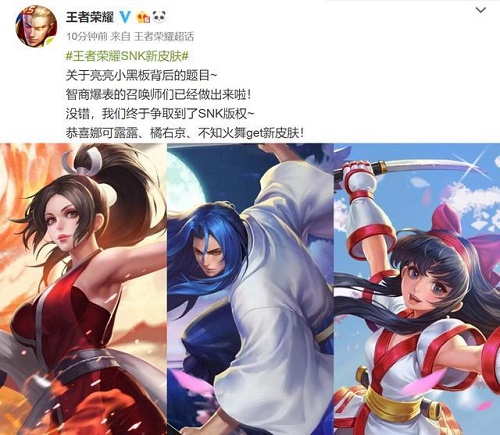 橘右京、不知火舞、娜可露露属于版权英雄,在没有授权的情况下,不能修改外观或商用,而这次官方已经取得SNK版权,意味着这三款新皮肤应该不会免费获取。