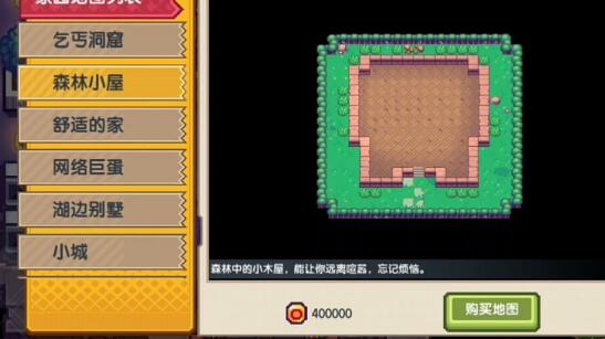 金币可购买的家园地图一共有两个,一个是森林小屋,一个是舒适的家,售价均为40万金币,区域大小都是一般般大的,但是好在能够用金币购买,其中森林小屋附带一个院子,区域偏小一点,但是景色更好。