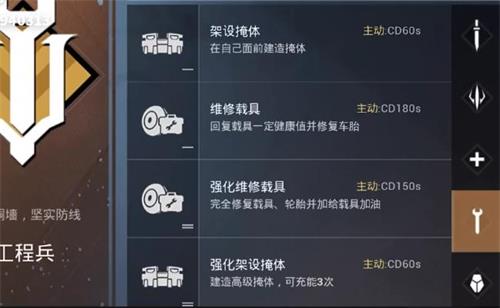 目前,已经公开的兵种共计有五个,即突击兵、机动兵、急救兵、工程兵、后勤兵,其能力如下: