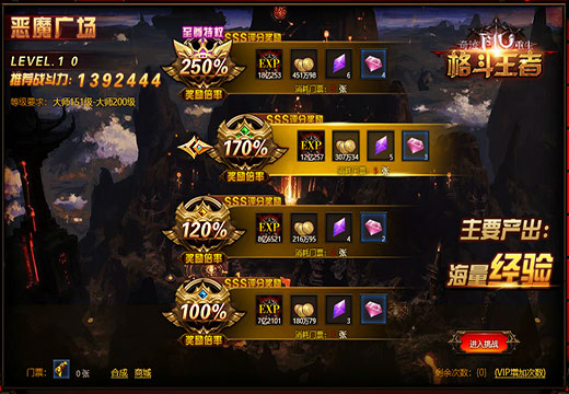 走进副本,我们期待的是激情的战斗,走出副本,我们渴望的是丰厚的奖励。《奇迹重生:格斗王者》独创多重奖励挑战玩法,玩家可以自由选择副本的奖励倍数,从最基本的100%到最高250%的副本奖励。每一次通关都是满载而归,每一次通关都让你金币满仓,经验暴涨!而且完成每天的副本挑战,还可以获得“活跃积分”收获更多奖励!