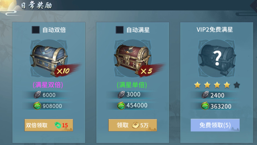 每天可以完成10个日常任务,对经验增长十分有效,每次完成任务后可以花费金币或仙玉选择高倍的任务奖励,也可以免费领取非满星奖励。