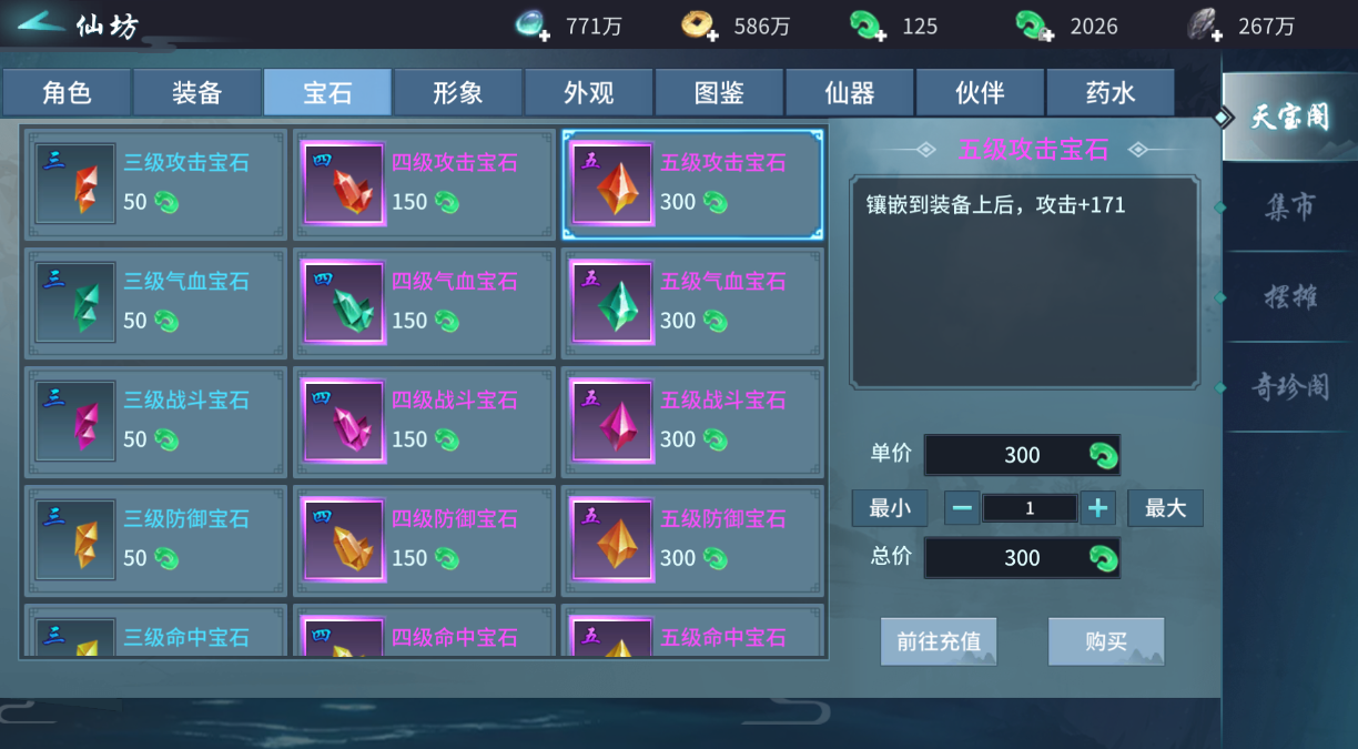 最后一个获取渠道就是游戏的商店-【仙坊】,进入【宝石】后可以看到各类型和等级的宝石,使用仙玉可以直接进行购买。
