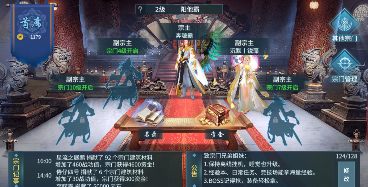 2、提升宗门等级可扩大仓库存量、职位数量;