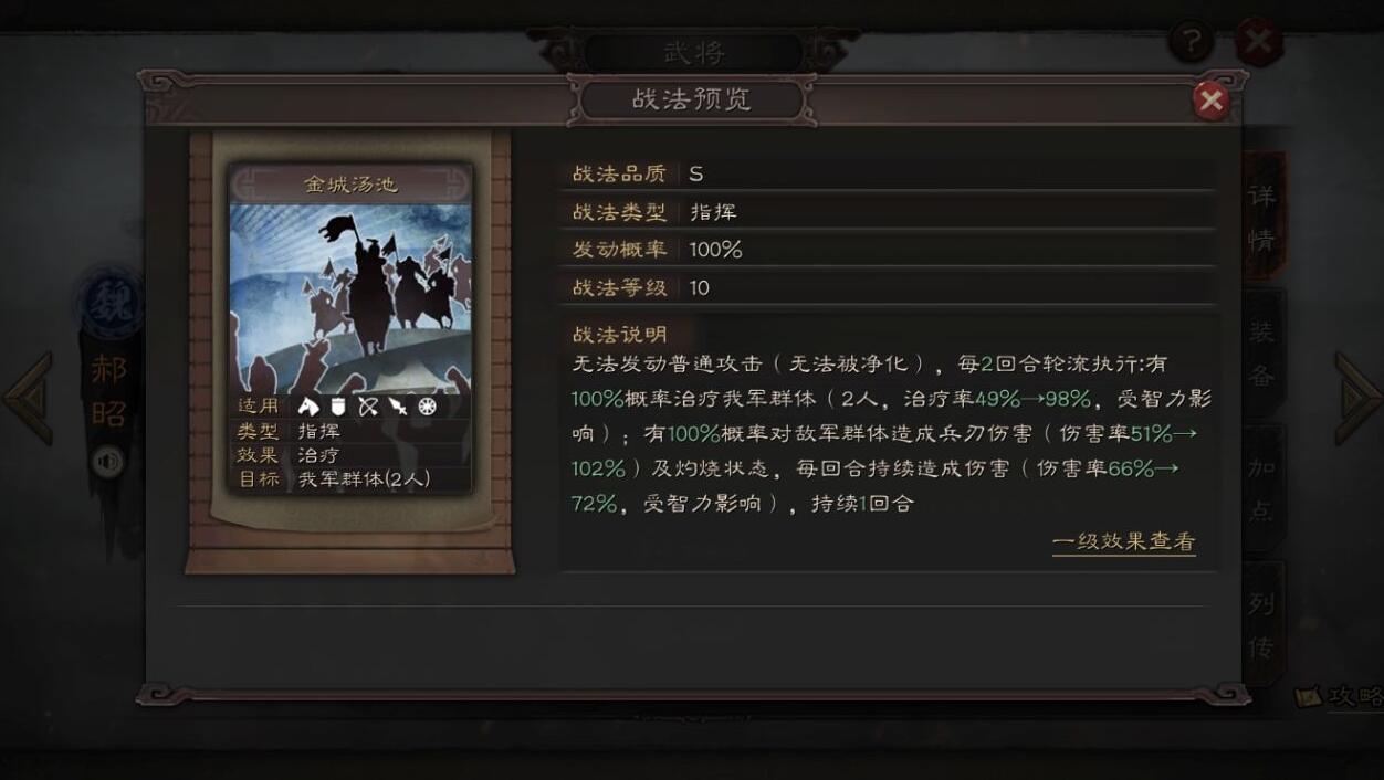 其实从面板上来看看郝昭的优点并不是很多,武力、智力都是比较平均的,统率也只能保持在中等偏上的水平,但是他的战法金城汤池可以说是非常厉害了,可以可提供稳定的治疗和伤害,治疗率、伤害率都可谓不低,又是100%发动的指挥技能。