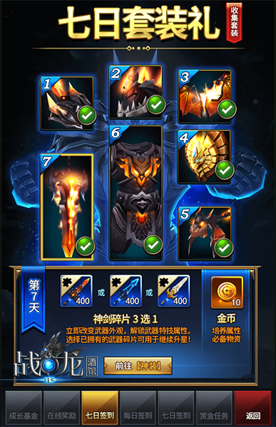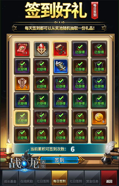 在线、签到奖励,首充豪礼、节日狂欢、限购、特典、返利……海量福利活动和资源,都将在游戏内呈现。 战龙酒馆拥有超丰富的活动助力玩家快速成长和体验游戏内容。游戏内还会掉落大量福利资源,用于角色属性和战力的提升。野外击杀精英怪、刷新怒焰巨龙、挑战世界领主、真人大乱斗等场景都可以掉落大量材料,还有概率获得珍稀道具。