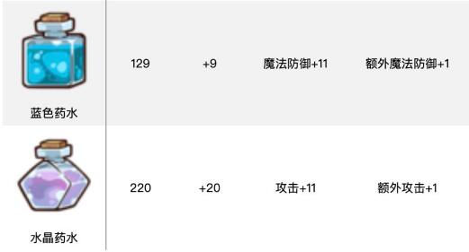 药水都有三个属性,分别是治疗能力,作用是使用时恢复生命值,然后是冷却时间,想要再次使用药水的等待时间,但是药水的等待时间都不会很长。第三是奖励,装备的药水后会有特定的增益。