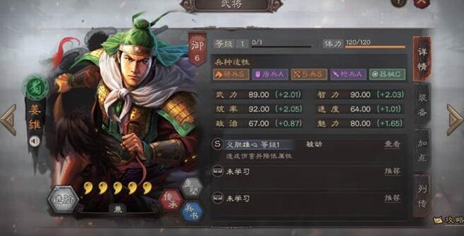 这个战法又能辅助又能造成伤害,回合数越多我们造成的伤害也就越多,另外这里也要提醒玩家们一点,我们降低敌人的属性只会刷新,并不会叠加哦。姜维还有一个传承战法形机军略,发动几率为百分之四十,可以造成兵刃伤害和谋略伤害,可以说是文武双全了。