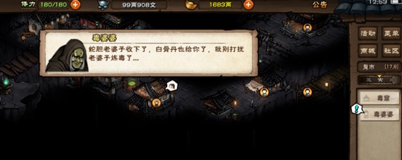 我们随后去药王谷找到药王通过对话来选白骨丹,不过很可惜需要找材料才能炼丹,随后去找毒婆婆来获取炼丹的线索,这个毒婆婆在鬼市场景的(17.8)这个位置,需要的材料有骨头*40、虎骨*20、鹿茸*5、人参*5,另外还需要十个蛇胆作为报酬。