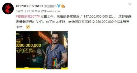 CDPR在4月末推送了《赛博朋克2077》1.22补丁之后,就又进入新一轮的BUG修复期。不过官方媒体发布了一条消息:V的朋友老维的身家暴涨了1470亿欧元,有了这么多钱,老维可以买得起12,250,000,000个XXL号玉米饼。