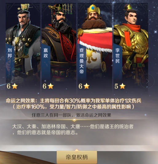 李世民与刘邦、嬴政、查理曼大帝任意二人在同一部队,能够激活帝皇权柄增益:“所在队伍主将每回合有30%概率为队伍单体治疗一次伤兵(治疗率160%,受力量/智力/防御之中最高的属性影响)。”