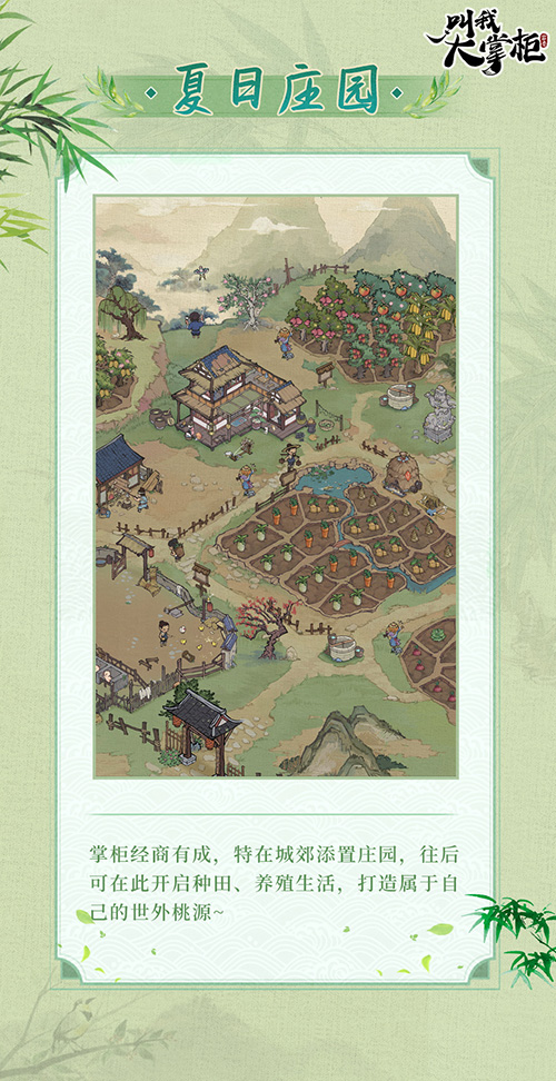 山水有相逢,有朋自远方来,不亦乐乎!在《叫我大掌柜》以一名掌柜的身份,开启自己的精彩古代商业人生,感受这座繁华魅力的汴梁城下,热闹喧嚣碎银几两的市井烟火,更少不了一览陆游笔下“莫笑农家腊酒浑,丰年留客足鸡豚”的田园图景。千年宋风,如诗如画。所谓“山重水复疑无路,柳暗花明又一村” 。随着本次内容的更新,游戏新增“庄园系统”,当掌柜的经商等级达到指定条件,即可前往汴梁城郊添置一座属于自己的庄园。通过农学作物、建造建筑、吸引住客等方式提升庄园繁荣度,从此春暖花开,一犬一马,尽享诗书画卷中的田园生活。