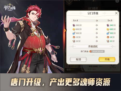 除了提升分堂的产出加成,《斗罗大陆:武魂觉醒》维序者们还可以升级唐门的整体实力。在唐门界面中,可利用宗门资金进行升级,全面提升资源产出能力。以宗门等级4级到5级为例,主角经验和金魂币的产出都有小幅提升。
