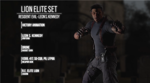 Lion的里昂精英皮肤采用《生化危机 4》中里昂的标志性外观(只是没有穿上他那身帅气的夹克),以及精英皮肤都有的胜利动作。Lion的标志性能力是一架揭示敌人位置的无人机,捆绑包内也将包括一个全新的无人机皮肤,以及武器V308、417、SG-CQB、P9以及LFP86的新皮肤,另外还有一个《生化危机》风格的武器挂件。