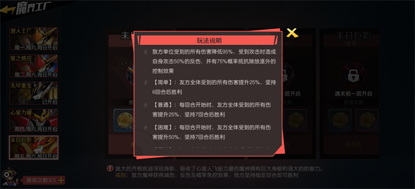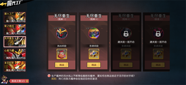 魔界工厂是最新的冒险玩法,作为创界山生产魔神小兵的兵工厂,玩家进入工厂,击败防守的敌人可以获得大量材料奖励。魔界工厂共有五个区域,每天开放一个区域,给玩家的奖励也不相同,不同区域有特殊的战斗规则会对玩家产生负面影响,玩家需要合理搭配魔神小队才能击败敌人。