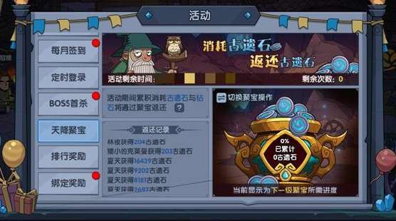 活动期间,通过聚宝返还古遗石和钻石的累积消耗。聚宝越多,获得的古遗石就越多!