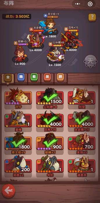 1、阵容如图,冠五吕布+公孙瓒+蔡文姬+太史慈+貂蝉
