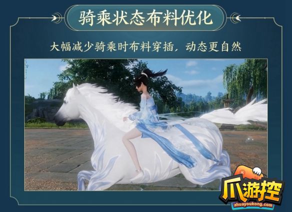 另外,骑马时的布料效果也得到了优化,大大减少了骑马时出现布料穿插的尴尬情况。后续,不论是骑马待机、行走、跑动,骑行的侠士衣着布料表现都会更符合动力学,且层次也更拟真,减少违和感。